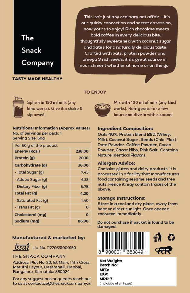 Crafted with 46% premium oats, a 25% protein blend of whey and milk, coffee powder, cocoa powder, cacao nibs, and enriched with omega-3 rich chia and flax seeds, it's a great source of nourishment whether at home or on the go. This perfect marriage of mocha flavors delivers the energy boost you crave with the nutrition your body needs.