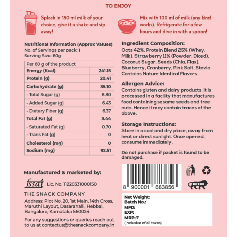 Oats 42%, Protein Blend 25% (Whey, Milk), Strawberry (Powder, Diced), Coconut Sugar, Seeds (Chia, Flax), Blueberry, Cranberry, Pink Salt, Stevia. Contains Nature Identical Flavors.